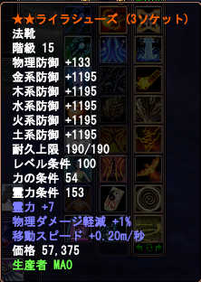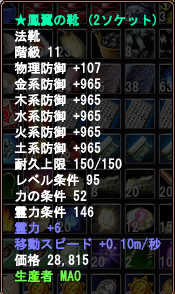 まず、HPは靴と腕は法衣15階級なので精錬+8でたしか+400くらいになります。