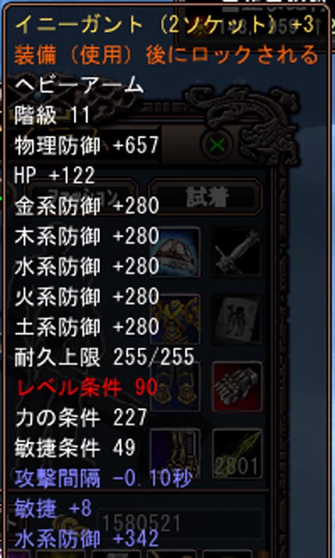 イニーガントの攻撃間隔マイナスと漆黒の手袋の攻撃間隔マイナス。ここに79タイムアタックマントが手に入るなら欲しいところですが、魔元爆発をすると2.5/秒なのでとりあえずの速くはここまでかな。
